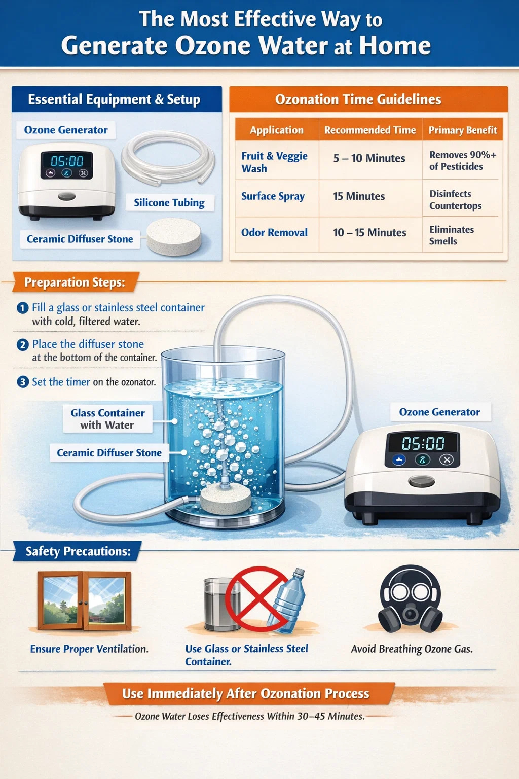 오존수 매우 불안정하며 생산 직후 살균력이 최고조에 달합니다. 야채 세척이나 조리대 소독과 같은 가사 작업의 경우 일반적으로 물 1리터에 5~10분 정도 버블링 주기를 주면 충분합니다. 소독제 많은 화학 세정제보다 뛰어난 효과를 발휘합니다.