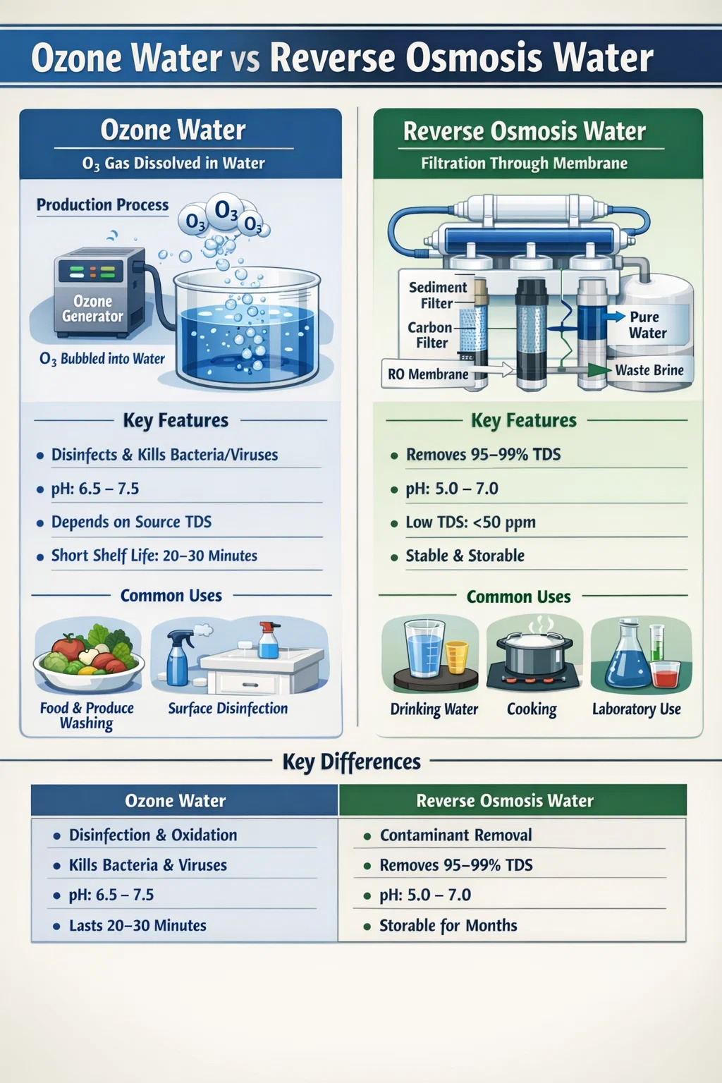 이 통합은 다음과 같은 핵심 사항을 강조합니다. 오존수와 RO수는 경쟁 기술이 아니며 처리 공정의 여러 단계에서 서로 다른 문제를 해결합니다. 오존은 생물학적 위협과 산화성 화합물을 처리합니다. RO는 용해된 염분, 금속 및 입자를 처리합니다. 이들은 함께 탁월한 순도의 물을 생산합니다.